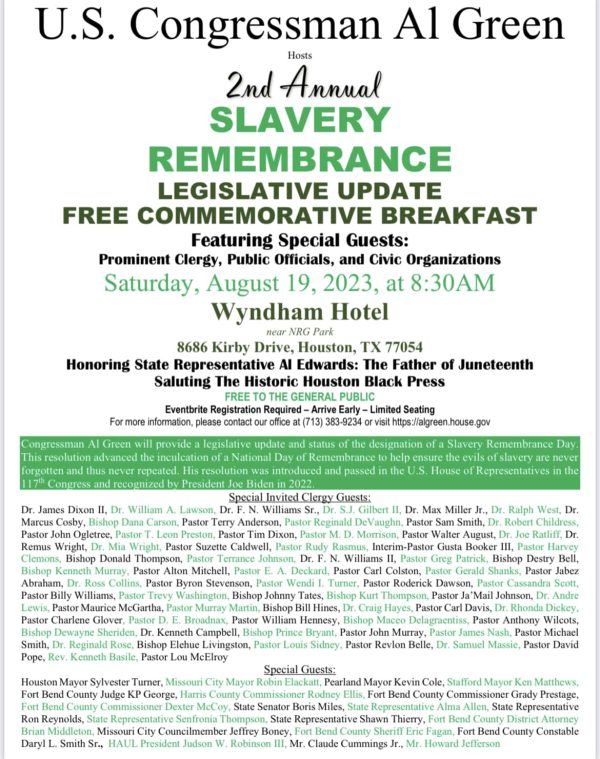 Join me for the 2nd Annual Slavery Remembrance Day Legislative Update & FREE Commemorative Breakfast on Saturday, August 19, 2023, at 8:30 a.m. located at Wyndham Hotel 8686 Kirby Drive, Houston, TX 77054. Please register for FREE online by clicking the link